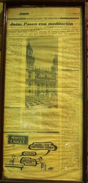 Fernando Quiñones siempre ha tenido una vinculación muy afectiva y cariñosa con Jaén y esta "Casa" Taberna Gorrión, es nuestro pequeña dedicatoria junto con sus amigos y colaboradores que dejaron así escritos en periódicos de la localidad de su paso por Jaén, y a la Taberna, como el escrito que él mismo nos hizo.