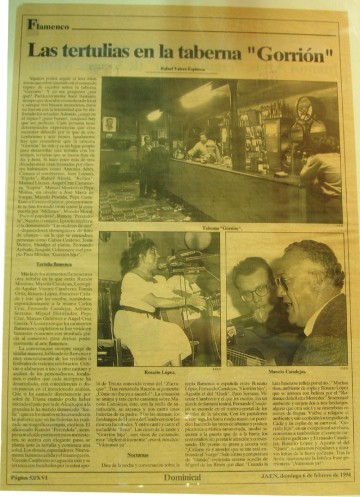 Tertulias en el "Gorrión” Rafael Valera –rafa para los amigos- nos deja un buen reflejo de la tertulias, moviéndose en el tiempo, ya que menciona la de antes con nombre y sus motes cariñosos con las de actualidad. Y en un alarde y lujo del buen escribir nos refleja el amigo Rafa una tarde que se junto al final con la noche, en un espontáneo día que entre clientes-amigos, –más amigos- en una charla, tertulia flamenca, se termina en una noche espléndida, magnífica e impresionante.