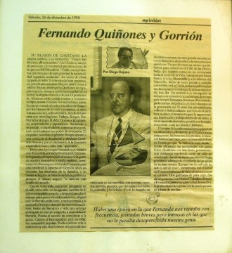 ….como en un rito íbamos por el Arco de Consuelo, con una ruta final: la taberna Gorrión, antes de ascender los escalones de la derecha, a su mente le llegaba la brisa de su bahía gaditana y siempre el mismo suspiro “la taberna más bonita del mundo”. Y otras tantas veces al entrar , eso sí por el mismo sitio, también decía “estoy empezando a oler a mar” ………… y este recorte de periódico termina diciendo……Dos gaditanos de pura cepa, dos almas gemelas: José Manuel Caballero Bonald (asiduo también a la taberna) y Fernando Quiñones, la brevedad, la sencillez, la profndidad de la prosa y de la poesía pesada en kilates de oro fino. 26 de diciembre de 1998